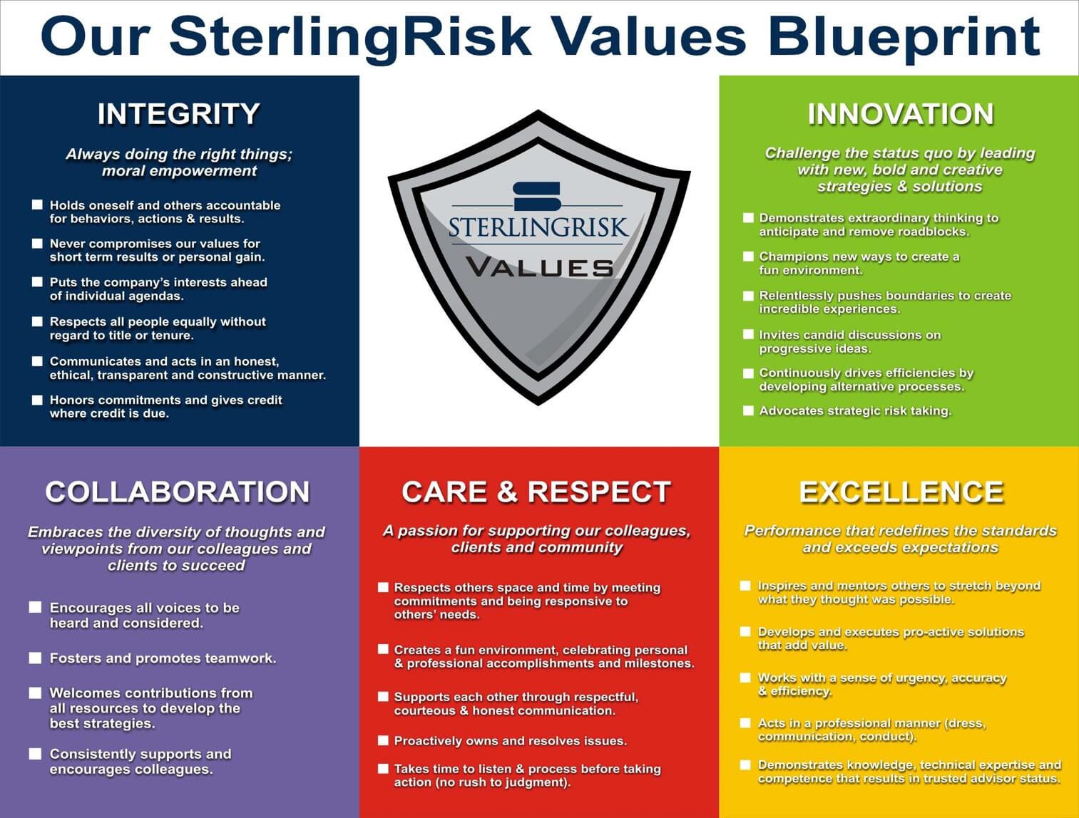 As a company, we have passionately and effectively executed on the mission of protecting people. It is with that same passion, that we turn our attention inward and work to transform our company culture. The senior executives along with a group of cross-functional employees crafted a core set of values and behaviors for the entire organization. The SterlingRisk Values Blueprint, which launched May 2, 2014, has become the foundation upon which we make every business, operational and people decision.